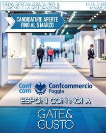 Confcommercio Foggia parteciperà a Gate & Gusto 2026, in programma dal 15 al 18 marzo presso gli spazi della Fiera di Foggia, con un’area espositiva dedicata alle imprese associate.