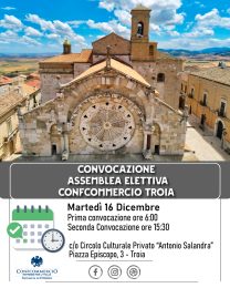 Per martedì 16 dicembre 2025, in prima convocazione alle ore 06.00 e in seconda convocazione alle ore 15.30, presso il Circolo Culturale privato Antonio Salandra (Piazza Episcopo, 3) è indetta l'assemblea elettiva degli associati Confcommercio di Troia per trattare i seguenti argomenti: