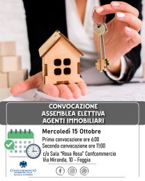 Per mercoledì 15 ottobre 2025, in prima convocazione alle ore 6.00 e in seconda convocazione alle ore 11,00, presso la Confcommercio di Foggia in via Miranda 10 "Sala Rosa Rosa", è indetta l'assemblea elettiva di tutti gli agenti immobiliari per trattare il seguente