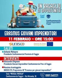 L’11 febbraio alle ore 15.00 i Giovani Imprenditori di Confcommercio Foggia promuovono un incontro dedicato al programma Erasmus per Giovani Imprenditori, iniziativa dell’Unione Europea rivolta a nuovi imprenditori e aspiranti tali.