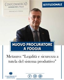 “In occasione dell’insediamento del nuovo Procuratore della Repubblica di Foggia, dottor Enrico Giacomo Infante, desidero rivolgere, a nome mio personale e di Confcommercio Foggia, un augurio di buon lavoro per l’importante incarico che si appresta a svolgere in un territorio complesso ma ricco di potenzialità. Il tema della sicurezza resta centrale per il mondo delle imprese sia per quelle di prossimità, che operano quotidianamente nei centri urbani e nei quartieri, sia per le imprese di media dimensione insediate nei siti produttivi e nelle aree industriali. Furti, rapine, atti vandalici e danneggiamenti rappresentano un freno allo sviluppo economico e incidono profondamente sulla serenità di chi fa impresa. Siamo consapevoli della brillante carriera del nuovo Procuratore e della sua profonda conoscenza del territorio foggiano, maturata nel corso degli anni. Un elemento che riteniamo fondamentale per affrontare con efficacia le criticità legate alla criminalità e per rafforzare il senso di fiducia degli imprenditori nelle Istituzioni. La sicurezza è una condizione essenziale per attrarre investimenti, tutelare il lavoro e garantire crescita economica. Confcommercio Foggia è pronta a collaborare in modo costruttivo, affinché il contrasto all’illegalità e la difesa delle imprese diventino leve concrete di sviluppo per l’intera comunità”, così Antonio Metauro, presidente di Confcommercio provincia di Foggia sulla nomina di Infante a Procuratore di Foggia.