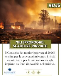 Importante novità per le micro e piccole imprese del settore turistico ricettivo e della somministrazione di alimenti e bevande: il Consiglio dei Ministri, nella seduta dell’11 dicembre 2025, ha approvato il decreto-legge “Milleproroghe” che sposta al 31 marzo 2026 il termine per la stipula delle polizze assicurative contro i rischi catastrofali, inizialmente fissato al 31 dicembre 2025.
